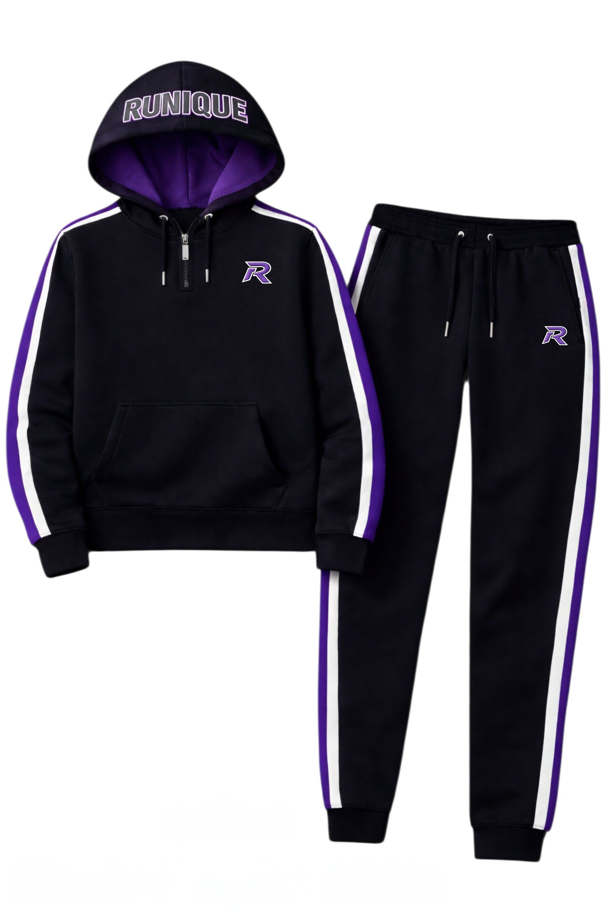 The hoodie features a structured silhouette with a ¼ zip neckline, offering versatility and comfort. An embroidered RUNIQUE logo on the chest and the iconic “R” monogram add a discreet yet unmistakable brand signature, while the hood interior is lined in rich royal purple for a subtle premium contrast.